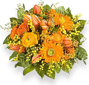 Joli bouquet rond composé de roses,gerberas et mimosa pour apporter un rayon de soleil!
